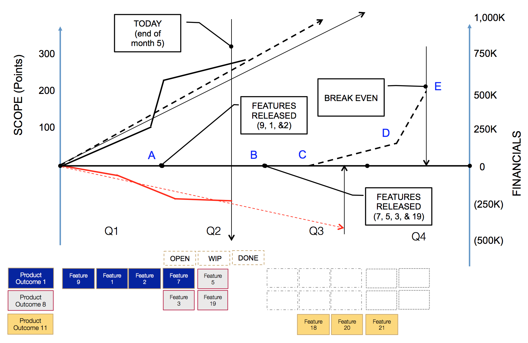 At the end of each Month the Agile Team should be creating a Financial Outcome & Benefits Chart to demonstrate working solutions is a primary measure of progress.