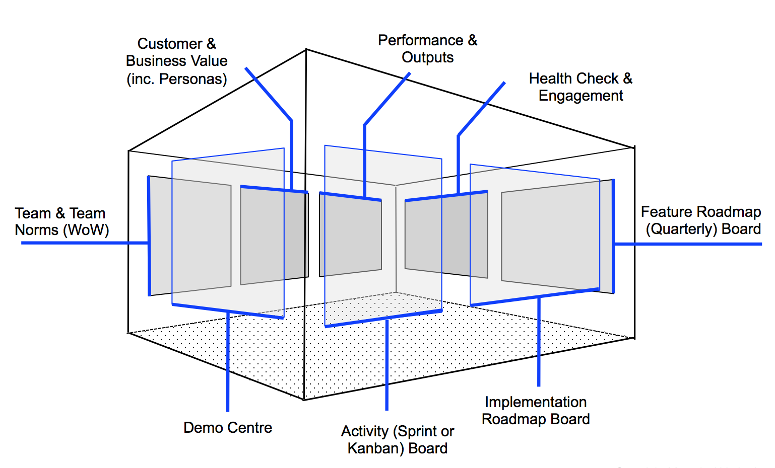 Whether the Agile Team has chosen to manage their product backlog and its implementation on a daily basis in a physical or digital world, they must remember to invest time displaying an array of visual management artefacts in their colocation space to encourage face to face communication. By bringing everyone together to discuss and create a common understanding of the purpose, goals, status of the agile team's work with the need for creating detailed and lengthy documentation.